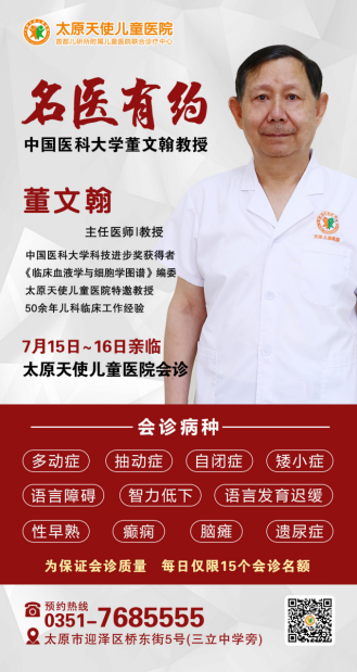近日,应广大患儿家长的强烈要求,7月15—16日,太原天使儿童医院再次邀请中国医科大学董文翰医生亲临我院,与我院医生共同为多动症、抽动症、自闭症、语言障碍等特殊疾病患儿进行联合会诊,多对一为患儿制定个性化诊疗方案!同时,为了保证会诊质量,每日仅限15个预约名额,有需要的患儿家长一定要提前预约哦!