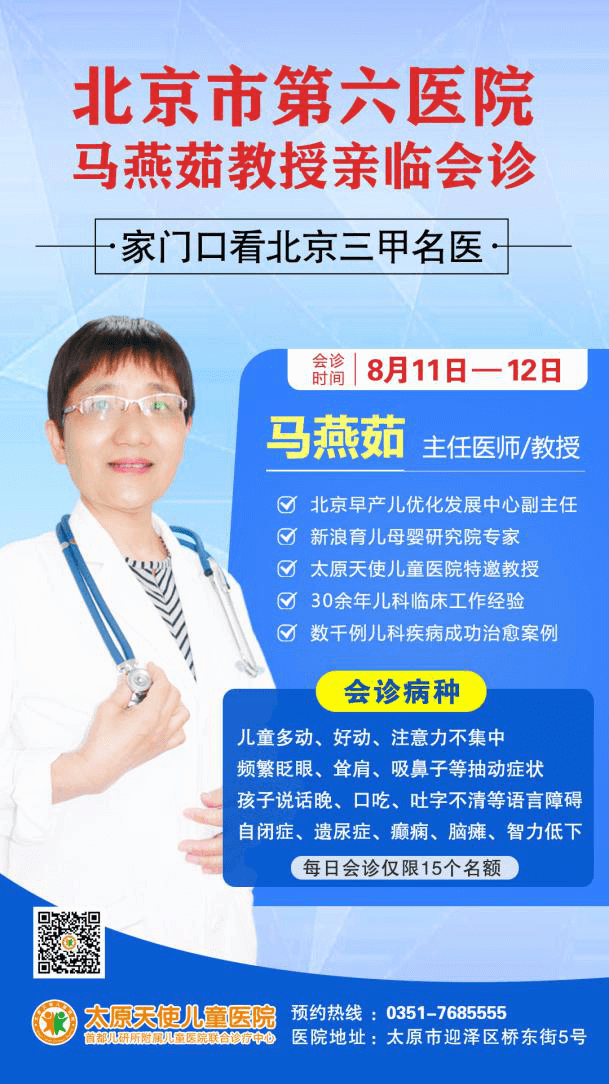 为了让特殊疾病患儿不用出远门,在家门口就能看北京名医,同时,也是应患儿家长的强烈要求。8月11-12日,太原天使儿童医院特邀北京名医马燕茹医生与我院医生共同为多动症、抽动症、自闭症、语言障碍、智力低下等特殊疾病患儿进行联合会诊,给孩子带来康复的希望!同时,为了保证会诊质量,每日仅限15个预约名额,患儿家长一定要提前预约哦!