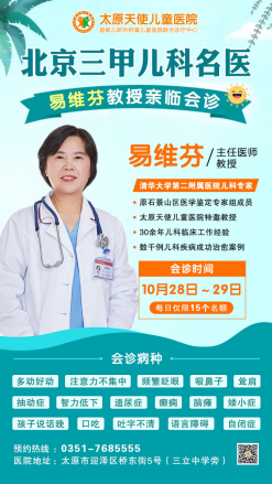 为了解决患儿看病的难题,让更多抽动症、多动症、自闭症、矮小症、语言障碍、智力低下等疾病患儿得到更好、专业的治疗。10月28-29日(本周三、周四)太原天使儿童医院特邀北京清华大学第二附属医院易维芬医生来院会诊。
