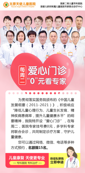 爱心门诊日预约名额有限,当日仅限15名,目前,下周二“爱心门诊日”预约通道已经开启,家长们可以通过网络、微信、电话等多种方式提前预约,预约热线:0351-7685555。