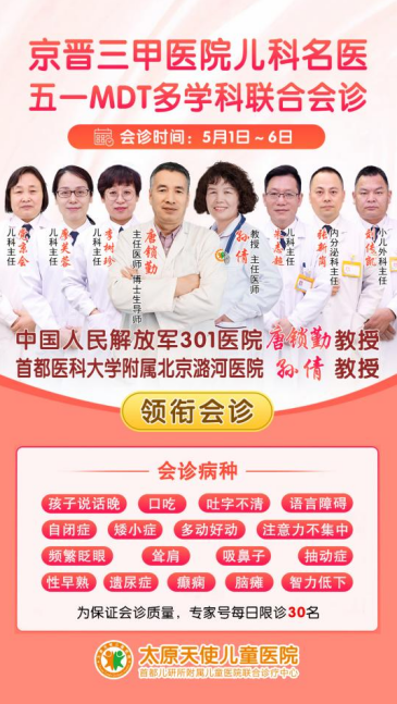 医生会诊周预约通道现已开启,网络、微信、电话等渠道均可预约。每日仅限30个预约名额,名额有限,有需要的家长请提前预约。预约热线:0351-7685555