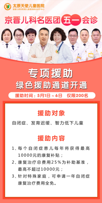 同时,为了减轻贫困患儿家庭的经济负担,中华少年儿童慈善救助基金会携手太原天使儿童医院,在五一期间,共同开展了公益援助活动,针对山西省自闭症、发育迟缓、智力低下儿童开通了绿色援助通道。