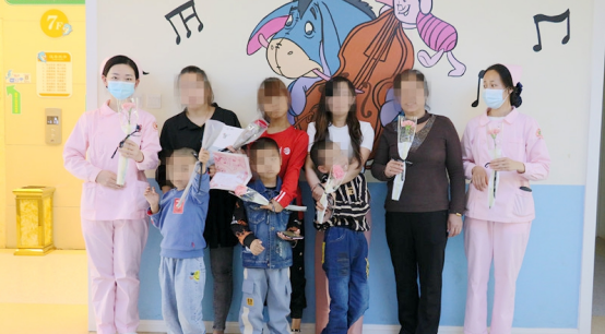 ”妈妈,节日快乐“,当”感恩小车“来到候诊区,护士小姐姐将提前准备好的鲜花和贺卡交给小宝贝们,让宝宝进一步尝试沟通,和妈妈表达祝福,没想到平常说话很少的患儿丹丹(化名)竟然送上了暖暖的祝福语,虽然仅仅六个字,但却让妈妈热泪盈眶。