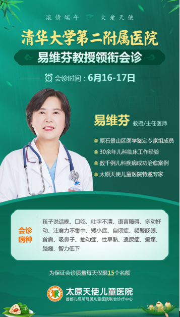为了更合理地配置儿科资源,让三晋患儿在家门口就能得到北京名医的诊治,6月16-17日,太原天使儿童医院特邀北京清华大学第二附属医院易维芬医生来院会诊。