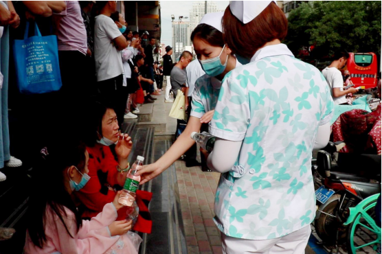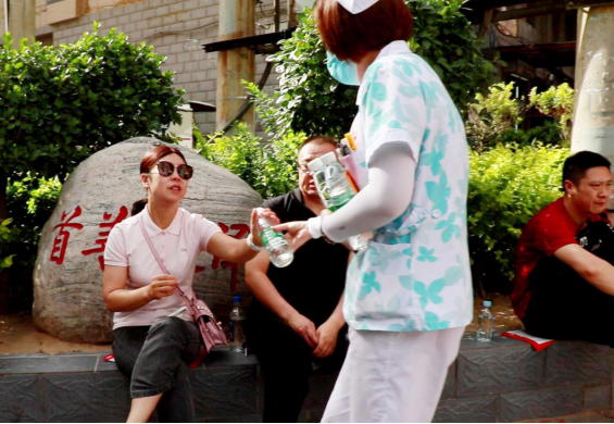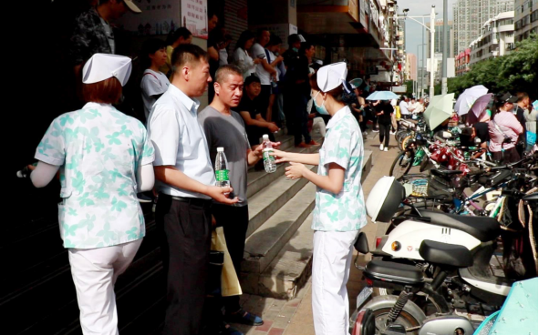 考试开始后,天使志愿者主动为校门外等候的家长发放矿泉水,帮助他们消暑解渴,并与家长耐心交谈,安抚他们的紧张情绪。