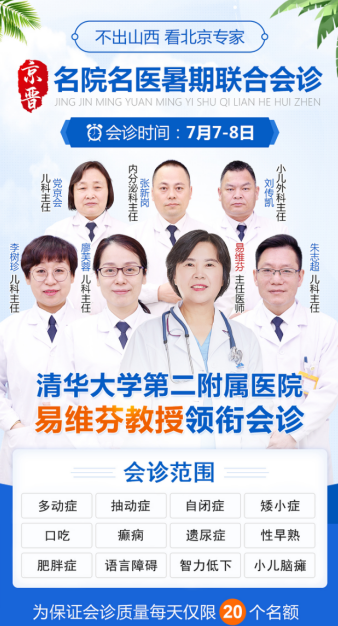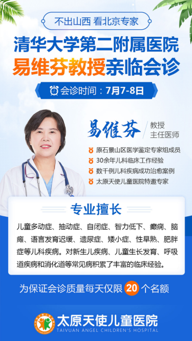 为了解决暑期“挂号难、看病难、看医生更难”的问题,让孩子们能便捷的享受到优吱业的医疗资源,7月7日—8日,北京清华大学第二附属医院易维芬医生,将莅临太原天使儿童医院领衔京晋儿科医生联合会诊,与此同时,符合条件的家庭还可参加康复治疗援助活动。