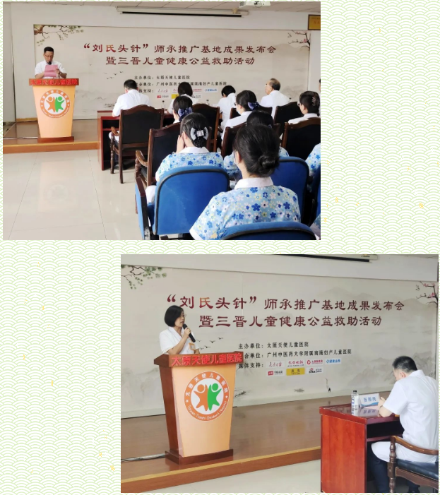 8月24日,“刘氏头针”师承推广基地成果发布会暨三晋儿童健康救助公益活动在太原天使儿童医院成功举办,国务院特殊津贴医生、儿童康复医生刘振寰在弟子朱志超、李树珍、冯梅、刘传凯陪同下出席了活动,太原天使儿童医院院长贾晋凤、院内儿科医生、天使医护人员以及新闻媒体人到场参加了会议。