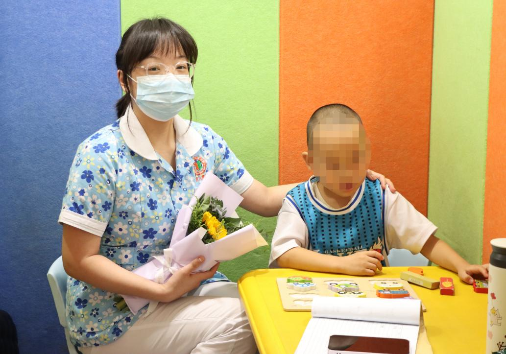 看到可以为老师送花,孩子们纷纷上前拿起鲜花,献给喜欢的老师。患儿小乐刚到院就诊时不会说话,现在已经可以捧上鲜花对着老师说“老师辛苦了,教师节快乐”,小乐妈妈也紧紧握着康复老师的手表达感恩之情。