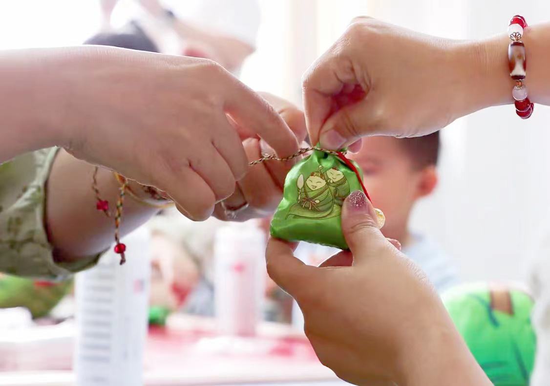 “五彩线,手腕绑,美好祝福在心间”,承载着祝福的五彩绳是端午节吉祥的象征,丝丝彩线环绕着家长和孩子们的手腕,寄托着美好祝福,祝愿孩子们健康成长。